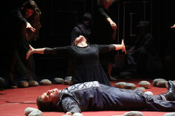Спектакли Василевой в определенном смысле можно назвать «эко-операми» – она любит метафорически обыгрывать природные предметы – дерево, лен, камень. Сценограф Александр Арефьев и художник по костюмам Мария Чернышева тут помогали. В «Орфее», не дожидаясь истории про главный лабиринт в «Ариадне», на сцене выложен лабиринтик из камней: его извилистая, но четкая форма периодически разрушается персонажами, привнося вселенский хаос.